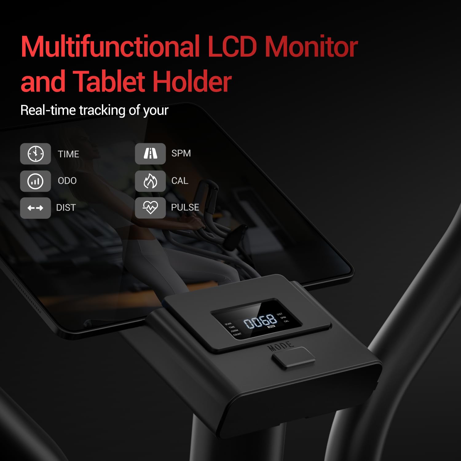 - Real-Time Fitness Monitoring: The built-in digital with our elliptical machine monitor provides instant access to essential workout data, including time, speed, distance, calories burned, and pulse rate. This comprehensive feedback allows you to set goals, monitor your progress, and adjust your workout intensity to maximize results. With all the information you need at your fingertips, you'll stay motivated and on track to achieve your fitness goals